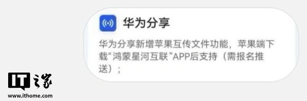 @魅小权 发现,华为分享功能迎来更新,新增与苹果 iOS、iPadOS、macOS 平台之间的文件互传功能(IT之家注:苹果端需下载“鸿蒙星河互联”App)。