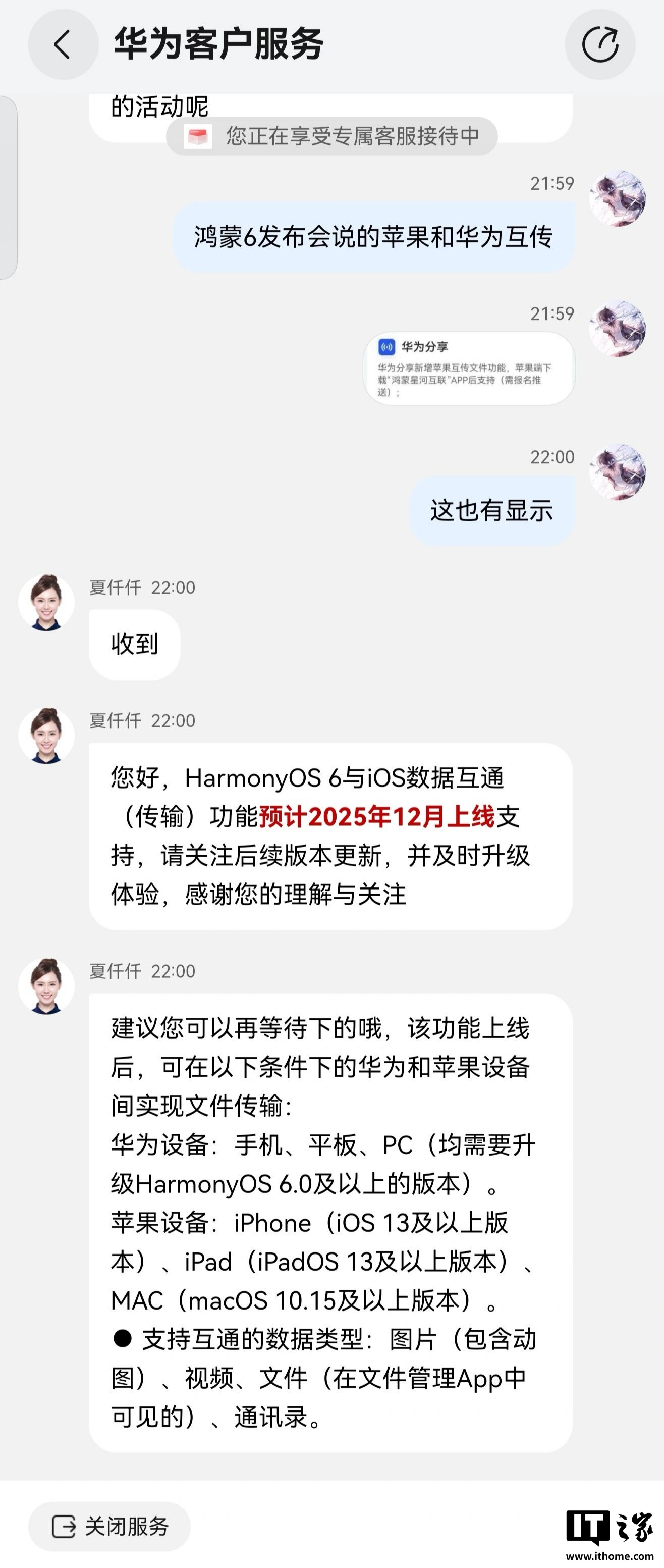 根据华为官方客服的解释,HarmonyOS 6 与 iOS 数据互通(传输)功能预计 2025 年 12 月正式上线支持。待该功能上线后,鸿蒙星河互联 App 可在以下条件下的华为和苹果设备间实现文件传输: